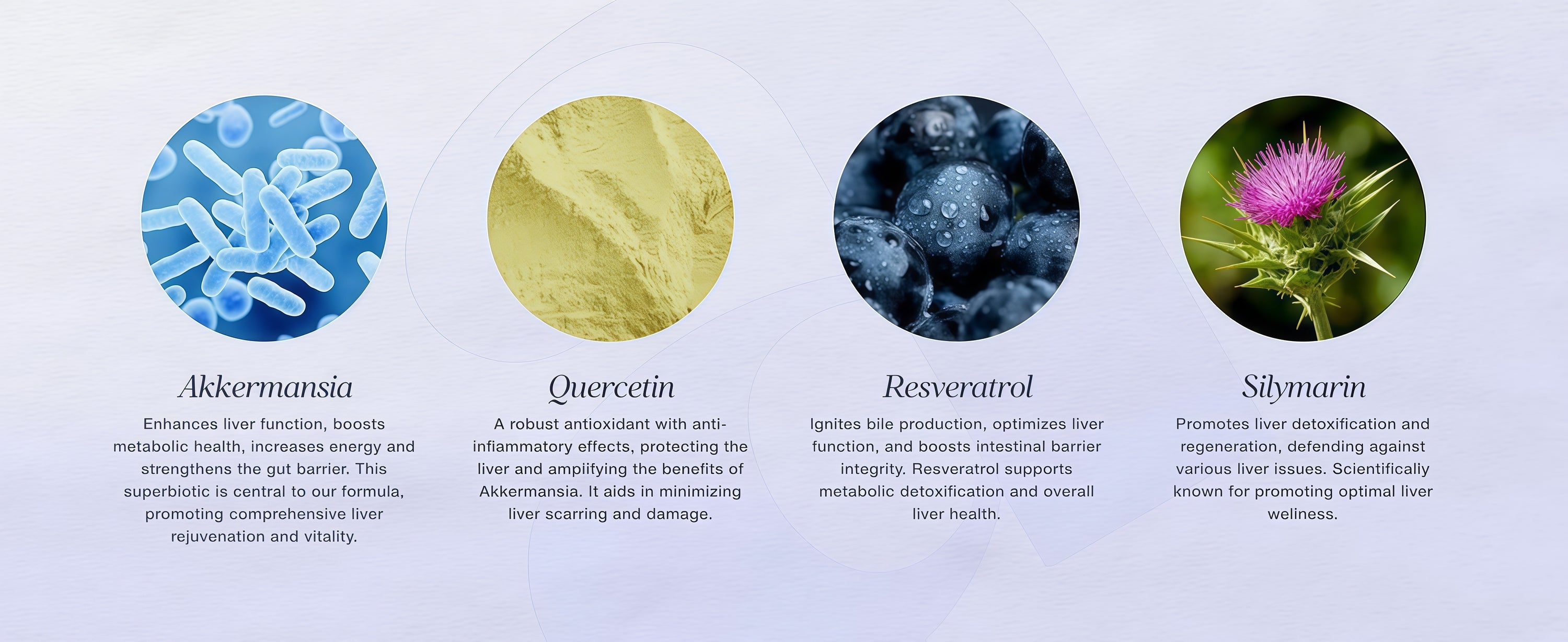 We combine Akkermansia, the world's most effective liver regenerative superbiotic, with 4 clinically proven liver-protective ingredients: Quercetin, Resveratrol, Silymarin, and Artichoke Leaf Extract.